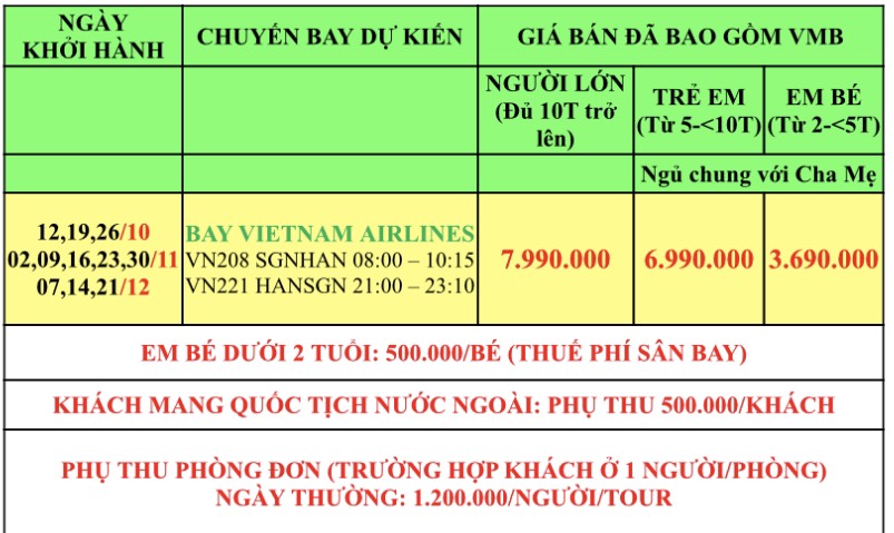 BẢNG BÁO GIÁ TOUR TRỌN GÓI DÀNH CHO 01 KHÁCH